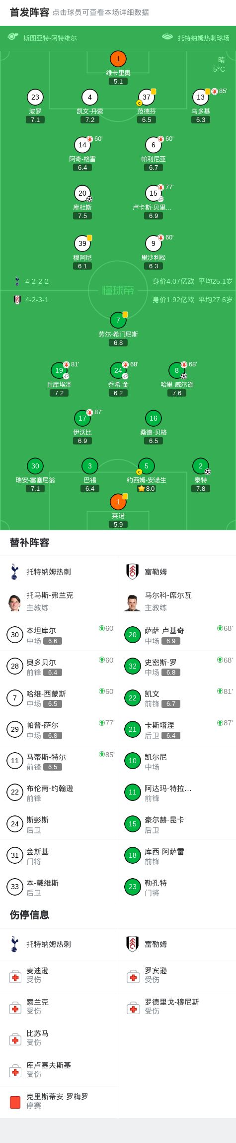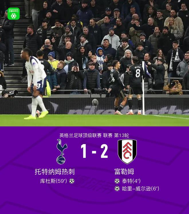 北京时间11月30日英格兰足球顶级联赛 联赛 第13轮,托特纳姆热刺主场对阵富勒姆。上半场泰特低射变线破门,哈里-威尔逊吊射扩大比分,丘库埃泽中柱,下半场库杜斯爆射扳回一球。最终比分热刺 1-2 富勒姆。