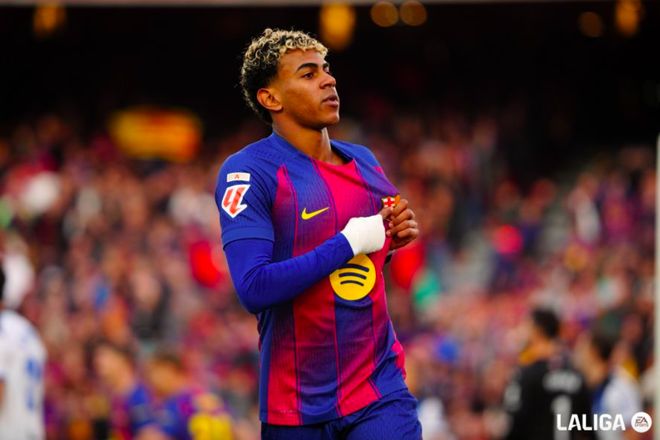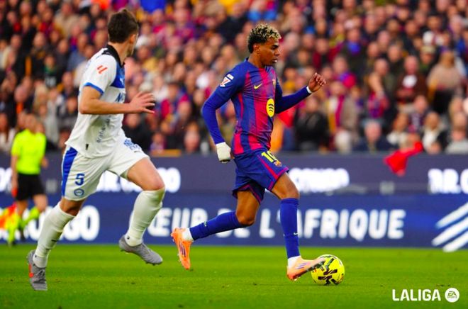 第10分钟,拉菲尼亚下底传中,奥尔莫一脚踢空,反而给了后点的亚马尔机会,亚马尔扳平比分。